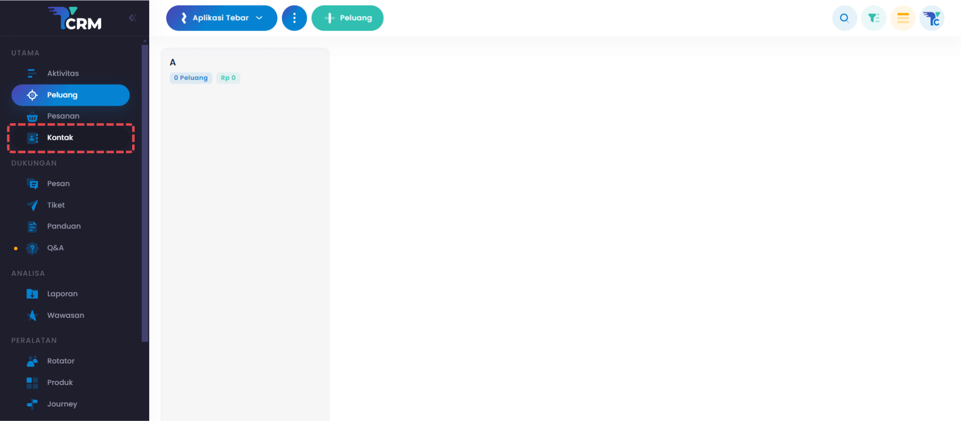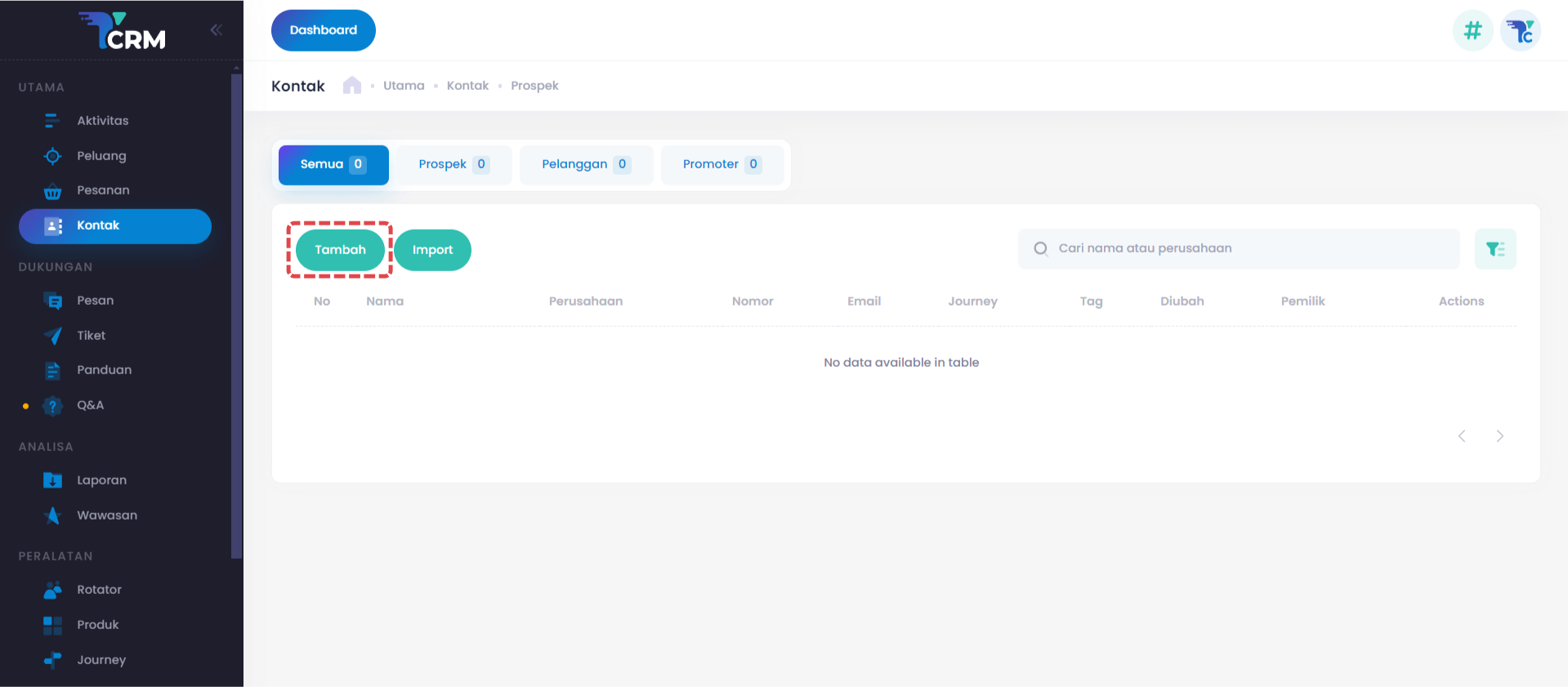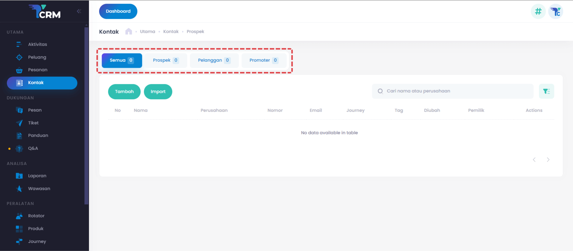 Anda akan diarahkan pada halaman Kontak. Pada halaman ini terdapat beberapa tab, yaitu Semua, Prospek, Pelanggan, dan Promoter.