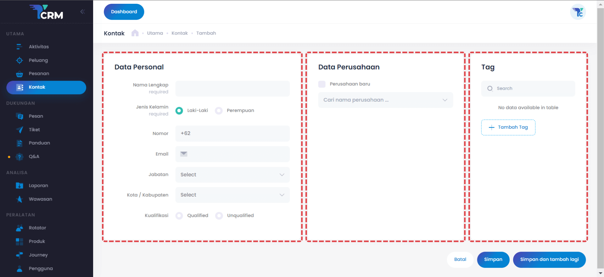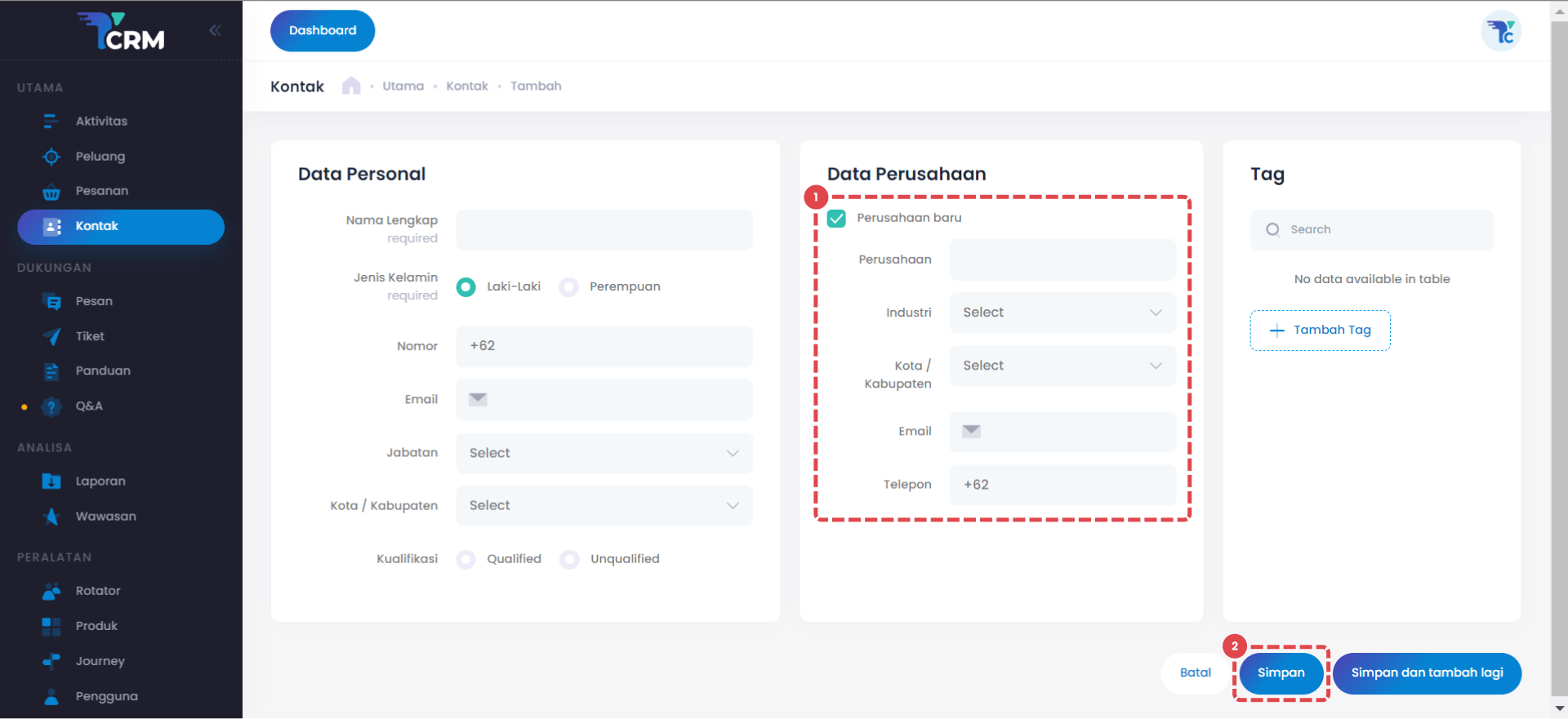 Isikan kelengkapan data Kontak, mulai dari Data Personal, Data Perusahaan, dan Tag. Apabila Data Perusahaan sudah ada sebelumnya, Anda dapat mencarinya pada Search bar pada kolom Data Perusahaan.